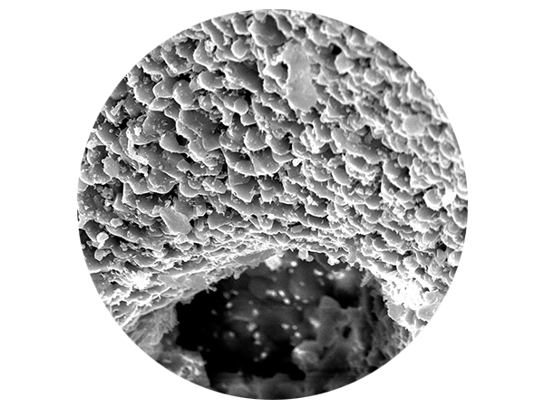 Os grânulos de osso bovino apresentam uma porosidade de ≈65–80% e uma rede interligada de macroporos (que facilitam a penetração de células osteogénicas e vasos sanguíneos) e microporos (que promovem a absorção de líquidos por capilaridade). Além disso, a superfície rugosa do CeraOss™ HYA favorece a adesão dos osteoblastos e das moléculas de sinalização, contribuindo assim para a integração das partículas ósseas.³ ⁴