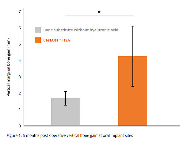 Em comparação com os pacientes tratados com CeraOss™, os pacientes tratados com CeraOss™ HYA apresentaram um ganho ósseo vertical superior, estatisticamente significativo nas faces mesial, distal e vestibular dos implantes, aos 6 meses de pós-operatório (*p < 0,05) (Fig. 1).¹⁴
