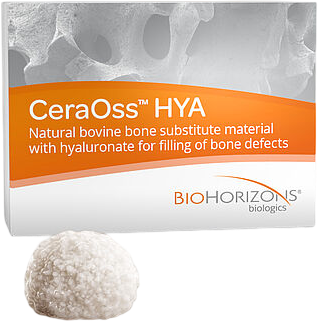 CeraOss™ HYA é um enxerto ósseo que combina as propriedades do osso bovino natural (CeraOss™) com as vantagens do ácido hialurónico, tanto na manipulação como na regeneração tecidular. Enquanto as partículas ósseas fornecem uma estrutura osteocondutiva e garantem uma estabilidade de volume permanente no local de aumento, o ácido hialurónico forma uma massa maleável que melhora o manuseamento do enxerto e facilita a sua aplicação em cirurgia. Assim, o CeraOss™ HYA oferece uma sinergia ideal entre facilidade de utilização e estabilidade de volume a longo prazo.